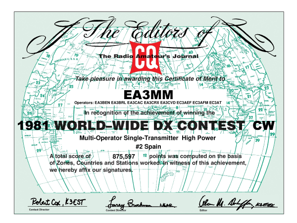 Com podeu veure al certificat adjunt, el 1981, els companys EA3BEN, EA3BRL, EARCAC, EA3CRX, EA3CVD, EC3AEF, EC3AFM i EC3AT, van aconseguir en CW el 2on lloc d’Espanya, el 60 d’Europa i el 120 del món.
